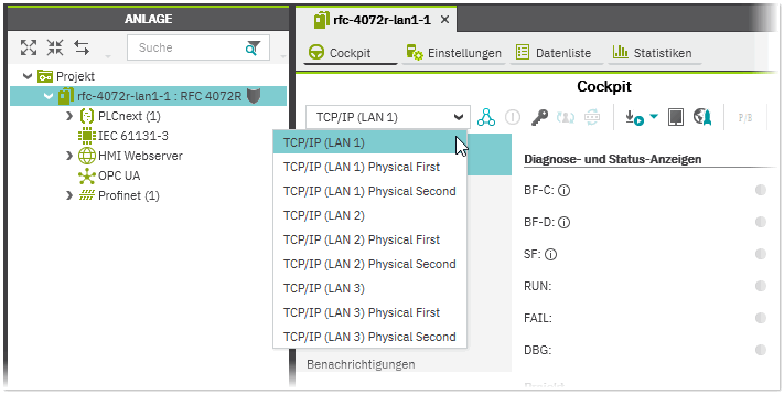 Beide Steuerungen sind über alle virtuellen und physikalischen IP-Adressen der LAN-Schnittstellen erreichbar. Der Zugriff auf die PRIMARY-Steuerung erfolgt über die virtuelle IP-Adresse. Über die physikalischen IP-Adressen beider Steuerungen (FIRST und SECOND) können Statusinformationen für die Diagnose des redundanten Steuerungssystems abgefragt werden. Die Auswahl des Kommunikationspfades erfolgt in der entsprechenden Auswahlliste im Steuerungs-Cockpit.