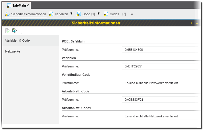 Der Editor zeigt die Prüfsummen, die für die POE, Variablen, Netzwerke und Code-Arbeitsblätter berechnet wurden:- Code-Prüfsummen werden nur berechnet, wenn die entsprechenden Verifizierungsmarkierungen gesetzt sind.