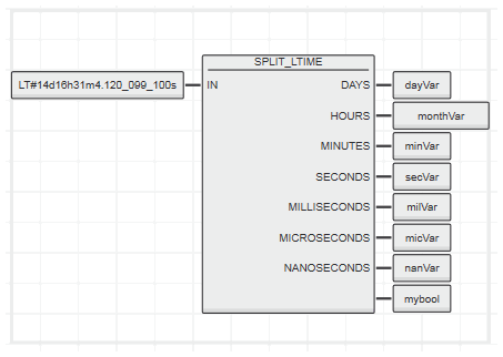 Beschreibung | Die Funktion trennt eine Zeitdauer (LTIME) in ANY_INT-Werte für Tag, Stunde, Minute, Sekunde, Millisekunde, Mikrosekunde und Nanosekunde. |