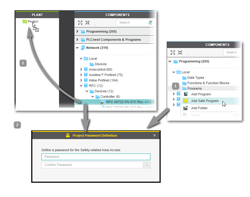 Das Kennwort für den sicherheitsbezogenen Bereich muss bei der ersten Bearbeitung sicherheitsbezogener Daten definiert werden. Dazu gehört beispielsweise das Einfügen einer sicherheitsbezogenen SPS in die ANLAGE (z.B. durch Einfügen eines Steuerungsgeräts, welches eine sicherheitsbezogene SPS enthält): das Gerät auf dem 'Projekt'-Knoten abgelegt wird, erscheint ein Dialog, in dem Sie ein Kennwort festlegen und bestätigen müssen. Das gleiche gilt, wenn Sie in den KOMPONENTEN eine neue sicherheitsbezogene POE anlegen, mit Hilfe der Befehle 'Sicheres Programm hinzufügen' oder 'Sicheren Funktionsbaustein hinzufügen'. Dies ist im nachfolgenden Beispiel gezeigt.