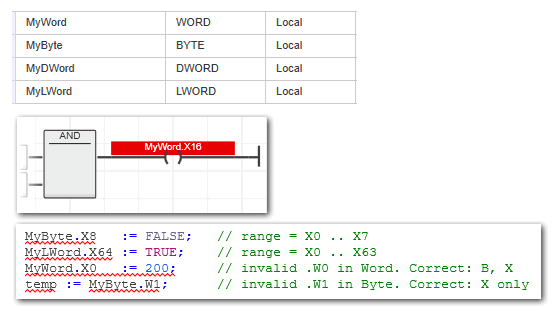 Word | MyVar.W0 ... MyVar.W3 | '.W0' adressiert das niederwertigste und '.W3' das hochwertigste Wort der Variablen 'MyVar'. |