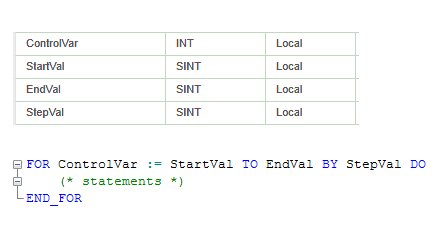 In einer FOR-Anweisung (ST-Code) müssen alle beteiligten Variablen (Kontrollvariable, Startwert, Endwert und Inkrementwert) den Datentyp ANY_INT haben (LINT, DINT, INT, SINT, ULINT, UDINT, UINT, USINT).