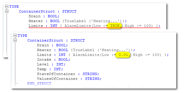 Fehlerbeispiel: Der Alarmgrenzwert Low erwartet einen numerischen Wert. Stattdessen ist ein BOOL-Wert zugewiesen.