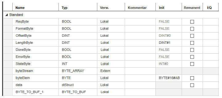 Mit einer steigenden Flanke am Eingang REQ startet der Kopiervorgang. Sobald der Schreibprozess abgeschlossen ist und der Wert 'AB' vom SRC Struktur-Element 'data.byteElem' in 'byteStream' kopiert wurde, wird 'TRUE' in die Variable 'DoneByte' geschrieben.