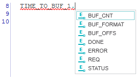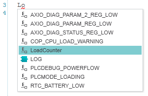 Die Intellisense-Funktion vereinfacht das Einfügen von Code-Elementen (Schlüsselwörter, Variablen, FB-Instanzen, Datentypkomponenten usw.) in textuelle Arbeitsblätter mit Hilfe der Tastatur. Wenn Sie ein oder mehrere Zeichen in das Arbeitsblatt eingeben, wird automatisch eine Auswahlliste mit allen Elementen geöffnet, die die eingegebenen Zeichen in ihrem Namen enthalten und die an der aktuellen Stelle eingefügt werden dürfen (Groß- und Kleinschreibung wird nicht unterschieden). Wenn Sie weitere Zeichen eingeben, wird die Liste entsprechend weiter gefiltert. In der Auswahlliste wird jedes Element mit einem Symbol und dem Elementnamen angezeigt.