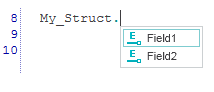 Um die möglichen Komponenten eines Code-Elements, wie z.B. die Elemente einer STRUCT-Variablen, die Ein-/Ausgangsvariablen (Formalparameter) einer FB-Instanz oder einen bestimmten Teil einer ANY_BIT-Variablen anzuzeigen, geben Sie einen Punkt nach dem Elementnamen ein. Die angezeigte Auswahlliste enthält nun alle Komponenten des gewählten Elements, die an der aktuellen Stelle eingefügt werden dürfen.