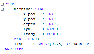 Hier wird mit dem ARRAY 'line' eine Produktionslinie mit 6 Bohrmaschinen (STRUCT 'machine') abgebildet. Über den Index des ARRAY kann auf jede einzelne Station zugegriffen werden. Über die Komponenten der Struktur können die unterschiedlichen Bohrwerte zugewiesen werden.