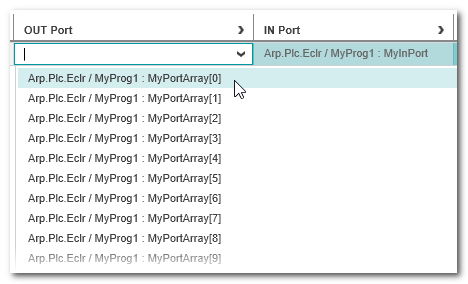 In einer GDS-Portliste (auf dem 'PLCnext'-Knoten oder auf einer Programminstanz in der ANLAGE) können Sie einzelne Port-Elemente eines Ports mit komplexem Datentyp einem anderen Port zuordnen. Beim Öffnen der Rollenauswahl werden nur passende Port-Elemente (Member) zur Zuordnung angeboten.
