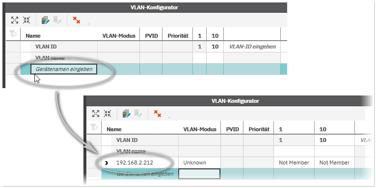 - Geben Sie im 'VLAN-Konfigurator' in das Feld 'Gerätenamen eingeben' die IP-Adresse des Netzwerkgeräts ein und drücken Sie <Eingabe>.