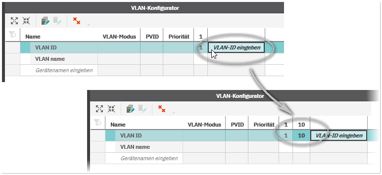 Sie haben mehrere Möglichkeiten, Geräte in die VLAN-Konfiguration hinzuzufügen und zu konfigurieren. Sie können die Geräte entweder direkt im 'VLAN-Konfigurator' einfügen und anschließend konfigurieren oder diese aus der 'VLAN'-Ansicht in den Konfigurator übernehmen.