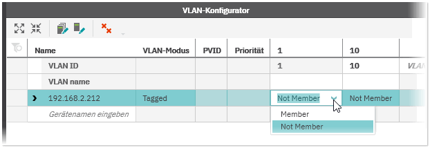 Die VLAN-Modus ('Tagged' oder 'Transparent') wird beim Schreiben der VLAN-Konfiguration auf das Gerät aktiviert (siehe unten stehende Beschreibung). Im 'Transparent'-Modus werden keine Änderungen auf dem Gerät vorgenommen, wenn die VLAN-Konfiguration geschrieben wird. - Wählen Sie für jedes Gerät aus, ob dieses ein Mitglied in den konfigurierten VLANs ist. Linksklicken Sie dazu in der VLAN-ID-Spalte in das entsprechende Feld und wählen aus der Dropdown-Liste den Eintrag 'Member'. Um die Zuordnung eines Geräts zu einem VLAN aufzuheben, wählen Sie 'Not Member'.
