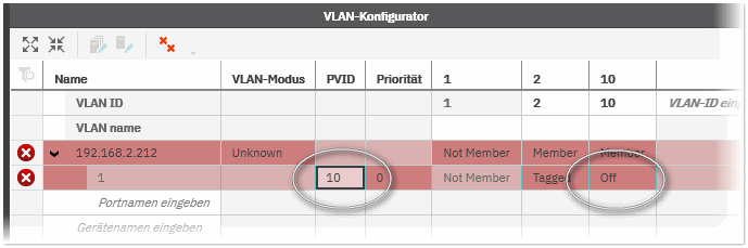 - Klicken Sie im 'VLAN-Konfigurator' auf den Pfeil vor der IP-Adresse des Geräts, um die Liste mit den Ports anzuzeigen, die dem Gerät zugewiesen sind. Geben Sie in das Feld 'Portnamen eingeben' die Portnummer ein und bestätigen Sie mit <Eingabe> (gütiger Bereich: 1 bis 999999).Der Port wird in die Konfiguration eingefügt. Beide Tabellenzeilen (Gerät und Port) sind rot markiert (ungültige Konfiguration). Um eine gültige Konfiguration zu erstellen, beachten Sie die oben aufgeführten Regeln und den folgenden Schritt.