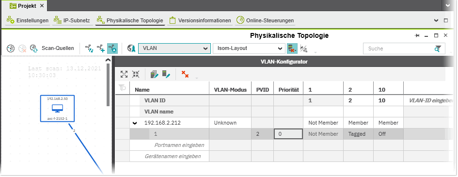 Die VLAN-Konfiguration der Netzwerkgeräte und Ports erfolgt im 'VLAN-Konfigurator'. Der 'VLAN-Konfigurator' ist ein Subeditor des 'Physikalische Topologie'-Editors und nur in der 'VLAN'-Ansicht sichtbar.