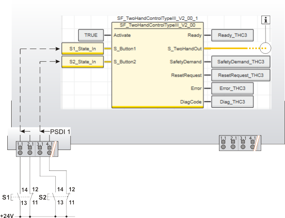 Dieses Beispiel zeigt die Verschaltung einer Zweihandschaltung vom Typ III mit dem sicherheitsbezogenen Funktionsbaustein SF_TwoHandControlTypeIII.