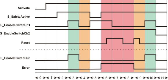 5 | Change from switching stage 1 to switching stage 2 (S_EnableSwitchCh1 becomes SAFETRUE again). However, as the operating mode is no longer active (S_SafetyActive = SAFEFALSE), the S_EnableSwitchOut output remains SAFEFALSE. |