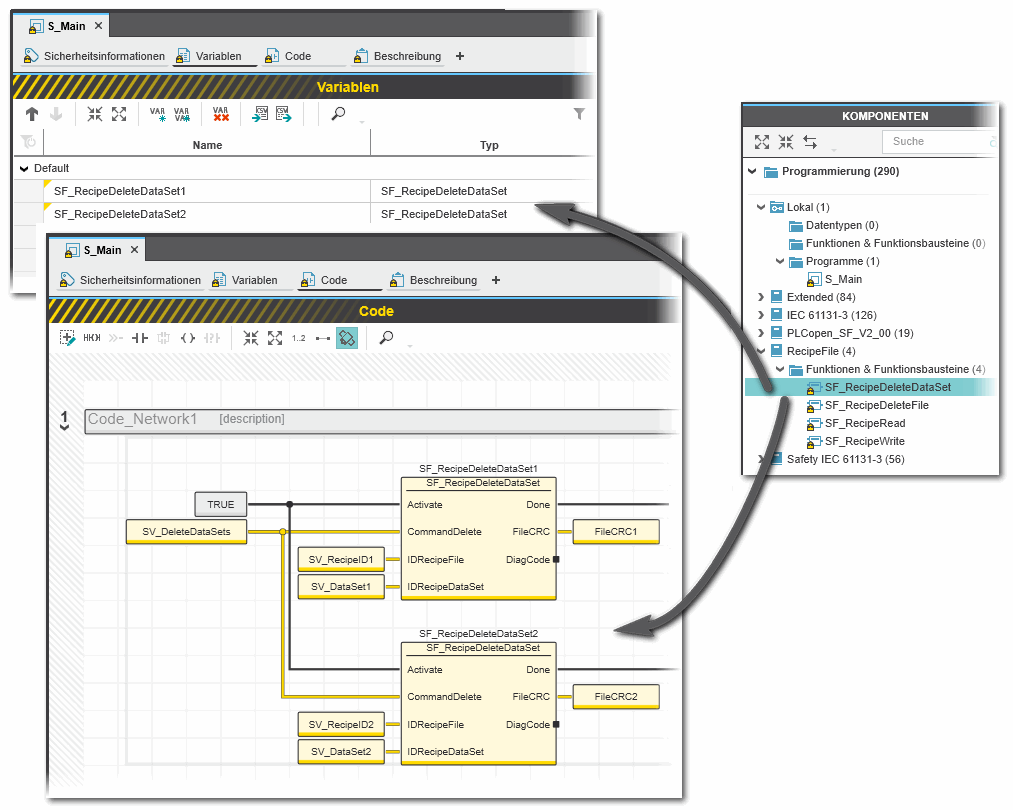 Der sicherheitsbezogene PLCopen-Funktionsbaustein SF_RecipeDeleteDataSet wurde über die Bibliothek 'RecipeFile' in das Projekt eingefügt. Er ist dann in der Kategorie 'Programmierung' des KOMPONENTEN-Bereichs verfügbar. Dort befindet sich ein Ordner mit demselben Namen wie die Bibliothek, aus dem sich die FBs in den sicherheitsbezogenen Code einfügen lassen. |