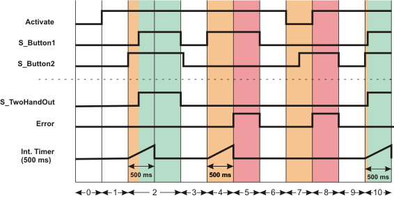 3 | The S_TwoHandOut output becomes SAFEFALSE, as S_Button1 and S_Button2 switch to SAFEFALSE within a short time of each other (buttons are released). |