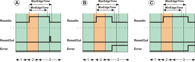3 | The operator releases the control device for the manual reset request (falling edge at the ResetIn input).Diagram A: if the falling edge of the request signal at the ResetIn input occurs within the time slot set by the MinEdgeTime and MaxEdgeTime inputs, ResetOut outputs the reset signal (TRUE pulse with a length of one cycle of the Sicherheitssteuerung).Diagram B: if the falling edge of the request signal at the ResetIn input occurs before the elapse of the MinEdgeTime time, no reset signal is applied to the ResetOut output and the function block detects an error (Error output = TRUE); refer also to function block behavior in the event of errors.Diagram C: if the falling edge of the request signal at the ResetIn input occurs after the elapse of the MaxEdgeTime time, no reset signal is applied to the ResetOut output and the function block detects an error (Error output = TRUE); refer also to function block behavior in the event of errors. |
