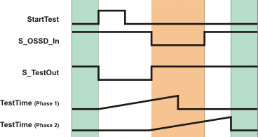 Sensor test phase 1: A rising edge at the StartTest input causes the S_TestOut output to switch to SAFEFALSE and the monitoring time set at TestTime (phase 1) to begin. The sensor must switch the S_OSSD_In input to SAFEFALSE within the period specified at TestTime.