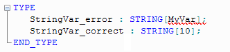 Error example: In the first declaration shown below, the string length is specified using a variable. This is not allowed. The second declaration shows the correct syntax.