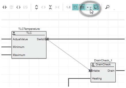 You can toggle the display of connection lines and auto-connectors. When drawing a connection line, the editor performs auto-routing: the editor finds the best route between objects and automatically changes the routing when moving these objects. If auto-routing is not possible, auto-connectors are used instead of connection lines.