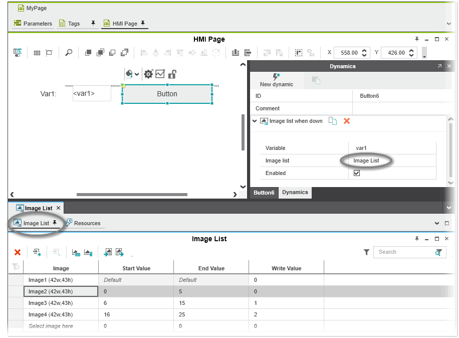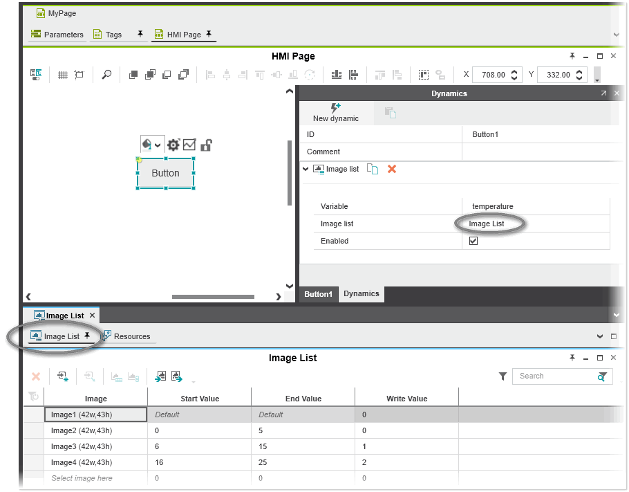 The 'Image list' dynamic allows to make image list entries dynamic. Dynamic means, the image for an HMI object at runtime can be selected by changing the HMI tag or variable (integer or floating point variable) connected to the 'Image list' dynamic. For example, you can use an 'Image list' dynamic for an HMI button object to display an image in the button instead of the numeric variable value if the variable value has a specific value or is within a specific range.