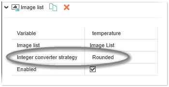 - Connect a numeric variable (integer or floating point) to the dynamic. To do so, click the input field right of the 'Variable' field and select a variable. The value of this variable determines which image the HMI object displays when executing the HMI application. Depending on the value of the configured variable, the image from the associated image list is displayed at runtime.When binding a variable or HMI tag of type REAL/LREAL to the 'Image list' dynamic, the 'Integer converter strategy' field is additionally shown. Here you can set whether the variable value is truncated or rounded before it is used as source value.