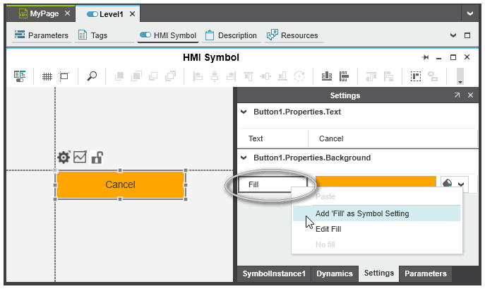 - To pass a published symbol setting to an outer symbol, open the 'Settings' tab of the HMI symbol instance and select 'Add property as Symbol Setting' from the context menu (the command is only available if supported by the property).