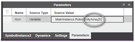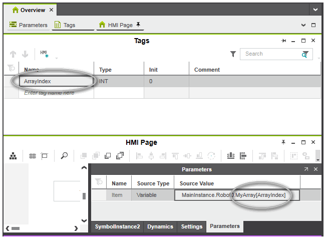 | 'Variable Path' | Only available, if the symbol parameter is of type UDT (user-defined data type).The 'Variable Path' option allows you to dynamically bind symbol parameters to a valid HMI tag using a string expression. Dynamic binding means, the string expression entered as 'Source Value' is evaluated to a valid HMI tag identifier at page load time. This allows to dynamically build the HMI tag identifier from the basis of the HMI tag instead of specifying it statically.Suppose your system contains 100 stations and they are all the same, i.e., they are all connected to the same HMI symbol. Each station is represented by an FB instance. Without dynamic binding, you have to create an individual HMI page with the HMI symbol for each FB instance. Dynamic binding now allows you to have one generalized detail page containing the HMI symbol that can be reused for each FB instance. Example: Your project contains an FB of the type MyRobot of which three instances Robot0, Robot1 and Robot2 are used. MyRobot is a UDT (for example a structure with the array MyArray). The members of the FB are accessed via the HMI tag identifiers Robot0.MyArray[0], Robot1.MyArray[0], Robot2.MyArray[0], Robot0.MyArray[1] and so on.Instead of having a different HMI page containing the HMI symbol instance for calling an instance of the function block and accessing a member of MyRobot, the same HMI page (with the symbol instance) can be re-used for each function block instance by dynamically binding the symbol parameter to the basis of the HMI tag. This means, on HMI page load time the HMI tag identifier is built depending on the value which is passed to the symbol parameter.To achieve dynamic binding, the helper function GlobalTag() is provided (the function is provided by IntelliSense in the role picker). Example for a 'Variable Path' definition using the GlobalTag() function: GlobalTag('MainInstance.Robot' + RobotID) This example builds the HMI tag identifier from the string MainInstance.Robot and the variable RobotID of type string when the page containing the symbol instance is loaded. If, for example, RobotID is "1" at page load time (passed to the symbol parameter), the string "MainInstance.Robot1" is evaluated to the HMI tag identifier. |