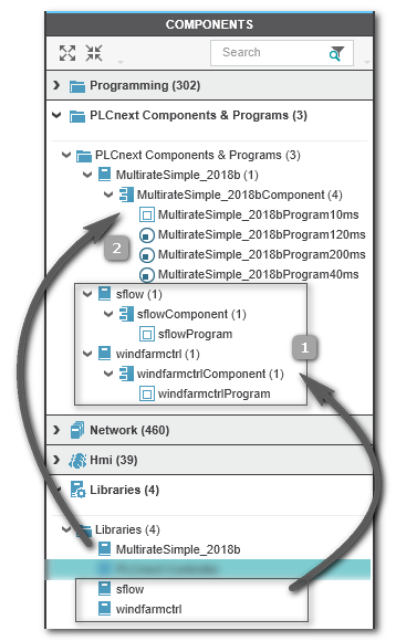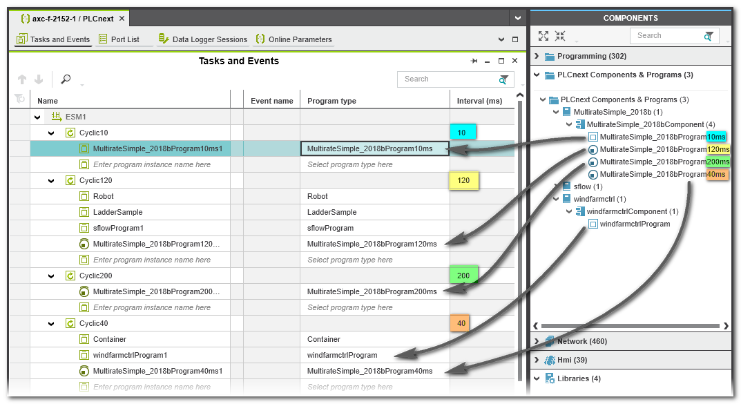 A multirate program must have been structured accordingly in Matlab® and the update rates must have been specified there for each partial program. When generating  (exporting) the PLCnext Engineer library in Matlab®, these partial programs are made available as separate subnodes (subprograms) which are visible in the COMPONENTS area after including the library. Such types can be identified by the  icon.