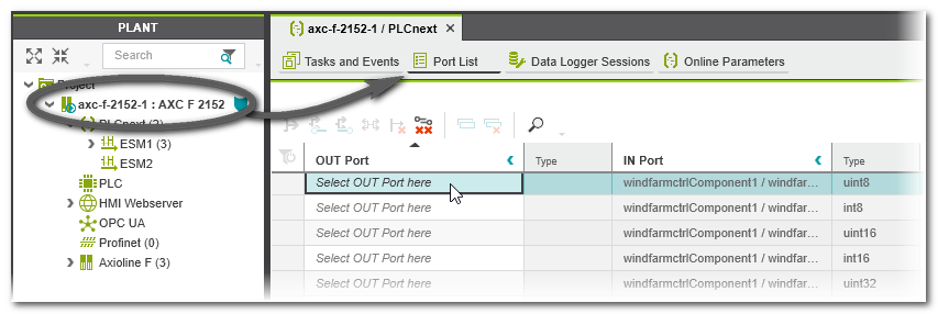 GDS Port List editor of the 'PLCnext' node. This list shows the ports available in the project. Here, also the ports of the newly instantiated external program are provided (except model-internal testpoints) and can be mapped to other ports of IEC 61131-3-compliant programs or non-IEC 61131-3 programs.You can also open the Port list of the program instance. For that purpose, expand the respective ESM node and task node in the PLANT and double-click the instantiated model. The handling of the Role Picker for mapping IN and OUT ports is described in the topic " GDS Port List ".- Map inputs of the Matlab® model to OUT ports available in your PLCnext Engineer application.