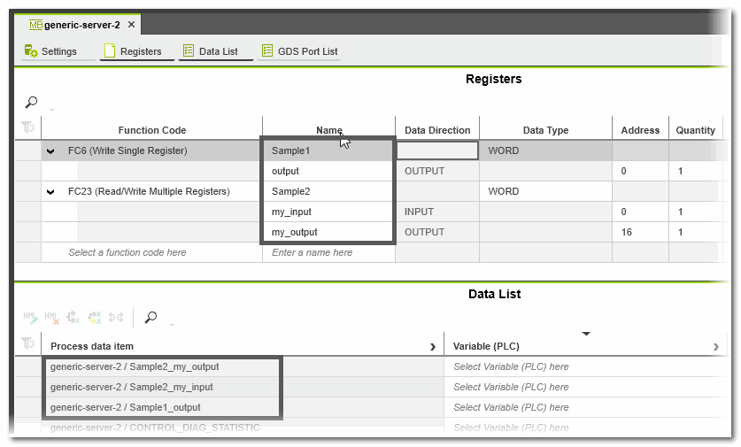 - In the 'Name' column, enter a register name (description of the register) and press <Enter>.Depending on the selected function code, an access type (default names: 'input' and/or 'output') is added (for each access type a new table row is added after the selected function code). In the 'Data List' editor of the server the process data item with the name built from the register name and the access type is automatically created. The same applies to the port name in the 'GDS Port List' of the server.