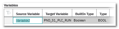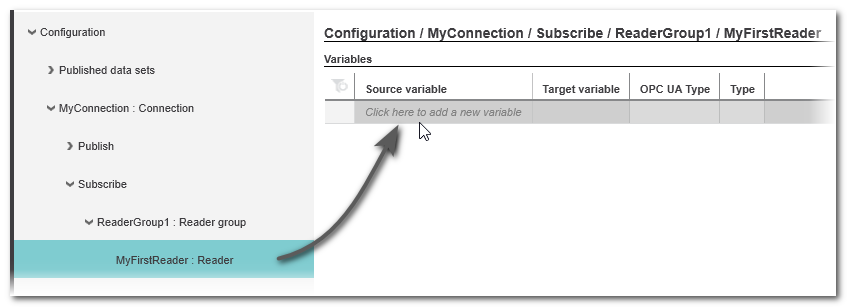 Since the configuration of publishers and the subscribers takes place in different projects, there can be no automatic check for these rules. When configuring the reader, you must ensure that the necessary information on the values contained in the subscribed data set is available and considered.According to the defined mapping, the reader will receive the values contained in the specified data set in the defined publishing interval from the writer specified by the Publisher ID, Writer group ID and Writer ID.You can modify the order of inserted variables by dragging & dropping them within the table: click and hold an entry in the row header.- In the 'Variables' table on the right, click into the 'Source variable' field of the lowest, empty table row.
