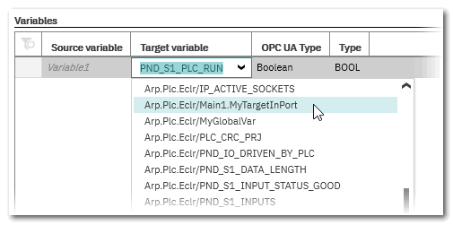 - Click into the 'Target variable' field to open a drop-down list offering all suitable target variables (IN ports and globals) which are defined in the project.