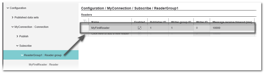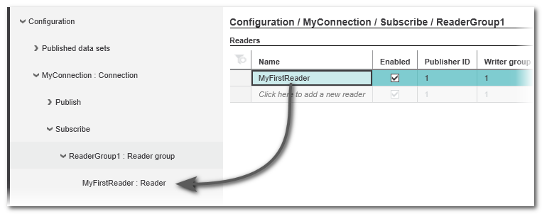 Which data a reader subscribes is defined by uniquely specifying the publishing writer. For that purpose, each reader has to know the Publisher ID, the Writer group ID and the Writer ID it has to listen to.