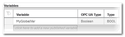 The 'OPC' attribute in POU variables tables is not relevant in this context. Ports and global variables can be added to a data set even if the checkbox is not selected in the declaration. You can modify the order of inserted variables by dragging & dropping them within the table: click and hold an entry in the row header. You can modify the order of inserted variables by dragging & dropping them within the table: click and hold an entry in the row header.