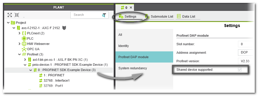 - Open the 'Settings' editor. In the 'Profinet DAP module' category, the parameters of the Device Access Point (DAP) are listed. If the 'Shared device supported' checkbox appears marked here, the device can be shared by several Profinet Controllers.