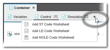 - In the editors area, click the plus icon on the right in the editor group (in the following example the 'Container' group) and left-click the type of code worksheet to be added.