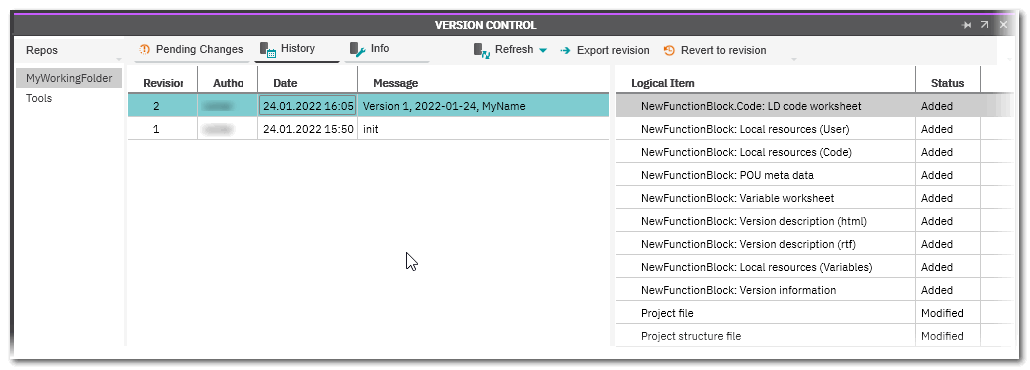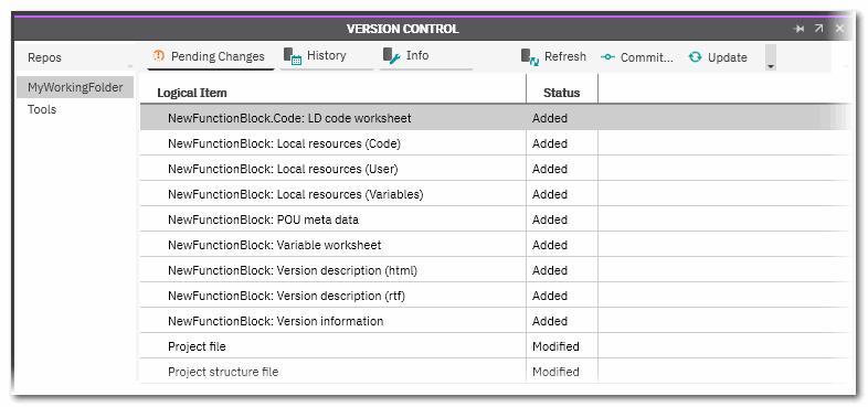 • PLCnext Engineer automatically makes a comparison with the latest version in the repository. Any modifications you made since you committed the version the last time are listed on the tab 'Pending changes'.