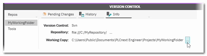 If a working copy folder (repository) is selected on the left side of the VERSION CONTROL window, the tabs 'Pending Changes', 'History' and 'Info' are visible on the right.