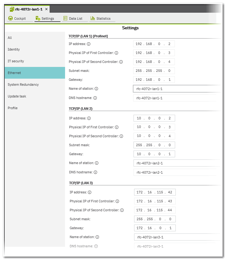 The configuration of the IP addresses for the LAN ports of the controllers is done using the 'Settings' editor of the controller node.
