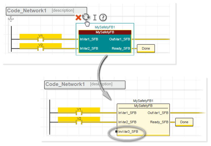Error example: an instance of the FB type MySafeFB is used in a code worksheet. Then, type MySafeFB is modified in the appropriate local variables table of the FB, for example, by adding an input. After this modification, the instance in the code worksheet has not been updated.