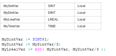The system allows the IEC 61131-compliant implicit data type conversion: particular data types are implicitly converted into another data type if both are used within the same expression. If possible, the implicit type conversion makes the use of an IEC 61131 type conversion function superfluous.