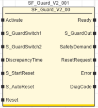 | Short Description | The safety-related  SF_Guard function block monitors a guard (e.g., door) with  according to the DIN EN ISO 14120 standard.S_StartReset can be used to specify a start-up inhibit and S_AutoReset can be used to specify a restart inhibit. |