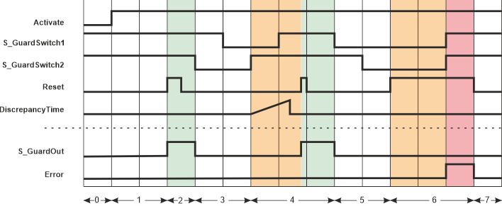 This diagram is based on typical monitoring of a guard with , where both position switches connected to inputs S_GuardSwitch1 and S_GuardSwitch2 switch within the time set at DiscrepancyTime.Additional assumptions: