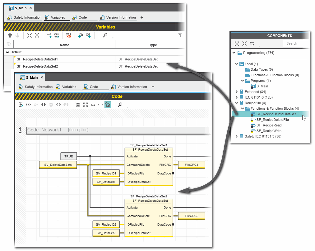 The SF_RecipeDeleteDataSet function block was inserted into the project via the RecipeFile library. It is then available in the 'Programming' category of the COMPONENTS area. There is a folder with the same name as the library that provides the FBs for insertion into the safety-related code.The FB is to be called twice in the code of the safety-related program 'S_Main'. For each FB instance, an instance name is declared in the 'Variables' table of the calling program: SF_RecipeDeleteDataSet1 and SF_RecipeDeleteDataSet2.  The FB instances have been inserted into the code worksheet, each instance  with different variables connected to its input and output formal parameters.