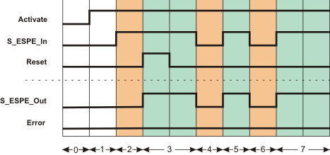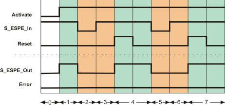 7Positive signal edge at the Reset input resets the restart inhibit, followed by normal operation. The S_ESPE_Out output becomes SAFETRUE.
