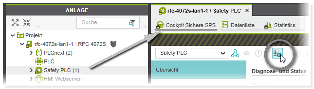 - Der Befehl steht auch im Kontextmenü der sicherheitsbezogenen SPS im ONLINE-STATUS-Fenster zur Verfügung (das im Cross-Funktionen-Bereich im unteren Bildschirmbereich zu finden ist).