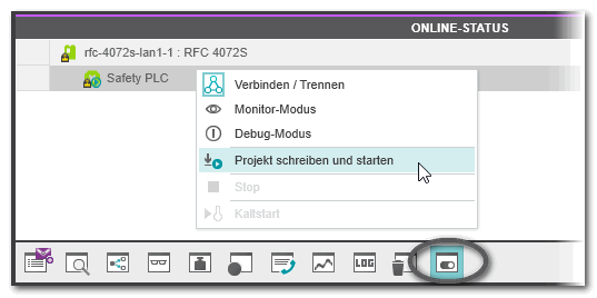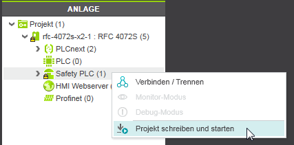 Beachten Sie den Sicherheitshinweis zu Beginn dieses Themas, wenn Sie das sicherheitsbezogene Projekt auf die sicherheitsbezogene SPS schreiben und die Anwendung starten.Weitere Informationen dazu finden Sie im Thema "Sicherheitsbezogene Anwendung steuern / Symbolleiste im Sicherheitscockpit".- Rechtsklicken Sie in der ANLAGE auf den 'Safety PLC'-Knoten und wählen Sie 'Projekt schreiben und starten' aus dem Kontextmenü.