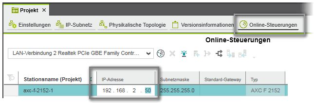 IP-Einstellungen im Editor 'Online-Steuerungen' bearbeiten (während Zugriff auf die Steuerung möglich ist)